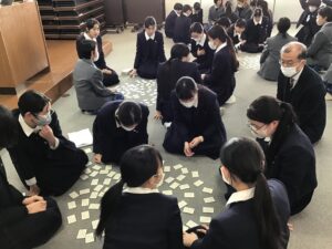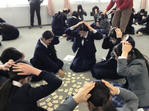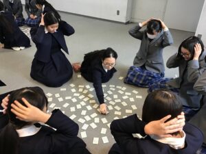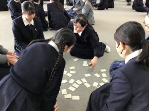 1月23日に百人一首大会がありました。今年は前年度同様に、腕に覚えありのクイーンコース、お楽しみのエンジョイクラスに分かれての実施となりました。クイーンクラス、エンジョイクラスともに白熱した試合となり、自分のお気に入りの札をとれたときには大喜びをする様子も見られました。