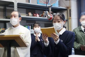 本日、クリスマス祭を行いました。 例年、体育館で「クリスマスミサ」と「聖劇」を行ってきましたが、昨年に引き続き、三密を避けるため放送で「クリスマス み言葉の祭儀」と朗読劇を行いました。「クリスマスみ言葉の祭儀」の司式は、福岡教区カトリック健軍教会主任司祭 渡辺隆義 神父様が行って下さいました。ありがとうございました。祭儀・朗読劇を通して、救い主イエス・キリストの誕生を祝い、神に賛美と感謝をささげます。 司祭さまのお言葉に耳を傾け、世界の平和を祈る、静粛な時間となりました。