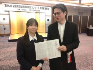 第45回全国高校生読書体験記コンクールで、グローバルコース2年 金山夕姫乃さんが一ツ橋文芸教育振興会賞を受賞し、1月26日(月)に東京で行われた表彰式に参加しました。
