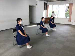 本日の朝礼では、数週間後に就職を控えた生徒が、他の生徒たちの前で面接のデモンストレーションを行いました。