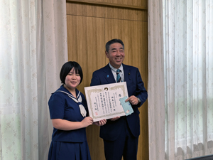 多くの議員の皆様や県民の方々にも見てもらえる機会をいただき、大変嬉しく思います。議長応接室での感謝状贈呈式の後、県議会副議長、熊本県文化懇話議員連盟の方々と歓談しました。本校からは、全国大会代表に選ばれた3年の岩﨑文音さん(信愛中出身)と九州大会代表に選ばれた福島かんなさん(合志中出身)が選ばれ、贈呈式に出席しました。