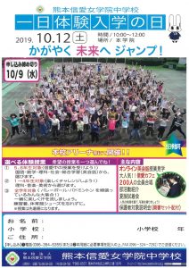 熊本信愛女学院中学校では、10月12日(土)に「一日体験入学」を開催します。