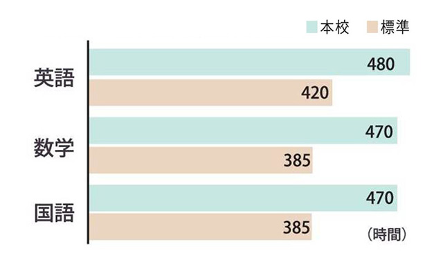 信愛中では、国語・数学・英語の主要3教科の授業を充実させ、授業時数をしっかりと確保しています。基礎・基本の定着を徹底するとともに、授業に加えて各教科の内容をさらに深く学ぶ時間も設けています。生徒一人ひとりの理解を大切にしながら、確かな学力の育成を目指します。