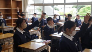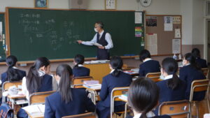 A組は保健、B組は数学の授業でした。生徒たちは、はじめはとても緊張していましたが、だんだんと先生の話に頷いたり、笑ったり、周りの友達と話し合うようになりました。定期考査や成績の話もあり、いよいよ中学の授業が始まった実感をもった生徒も多かったようです。