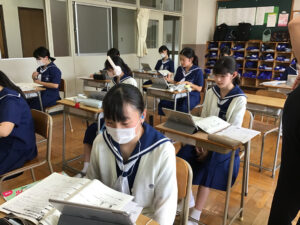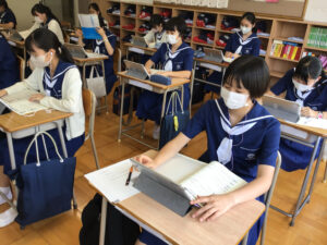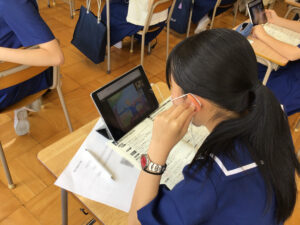 タブレットを用いて、ネイティブスピーカーと英会話を行います。1年生は最初戸惑いながらも、だんだんと会話を楽しむ様子が見られました。2年生はネイティブスピーカーとの英会話を楽しみながら、mustなどの助動詞を学びました。