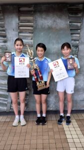 4月22日(日)に行われた熊本市中学生バドミントン選手権大会において、中学2年の永久凜さんが女子シングルス優勝、中学3年の甲斐楓果さんが第3位、中学1年生の山下咲姫さんがベスト16という結果でした。3人とも6月に開催される県大会に出場します。県大会でも活躍を期待しています。
