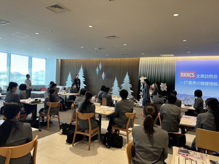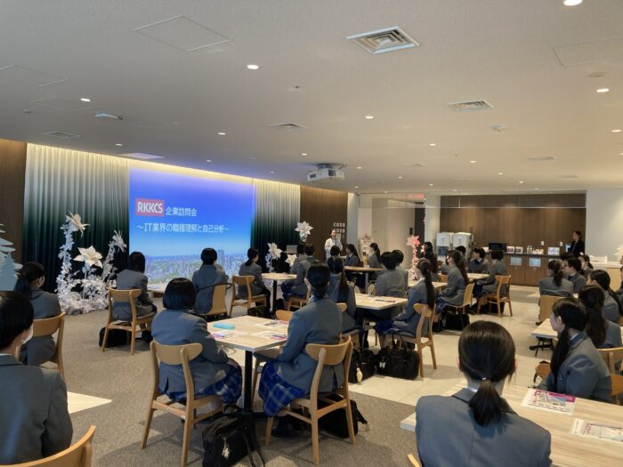 現在、中学1年生は、LHRの時間に「自分の将来を考える」と題して、どのような職業が世の中にあるか知り、自己理解や適性などについて楽しみながら学習を進めています。今回はその一環として、本校で6月に中学生対象に行われたセミナーで講演をしていただいた株式会社RKKCSを訪問しました。