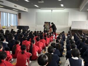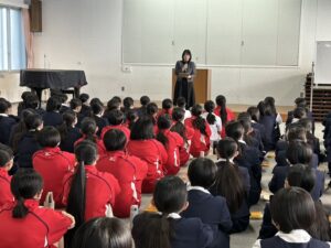 その後、中学主任の壬生先生からは、学習発表会に向けての諸注意と卒業した先輩たちからの学習発表会にむけてのアドバイスが紹介されました。2分前着席や清掃時の無言清掃などの日々の積み重ねと準備が学習発表会成功の鍵であるという話をされました。先輩たちのアドバイスに忘れ物や下準備の大切さを伝えるものが多くありました。これから学習発表会までの期間、忘れ物をゼロにする事と2分前着席を徹底することから始めてみましょう。学習発表会まで1日1日を大切に過ごし、最高の思い出になるように頑張りましょう!