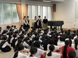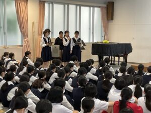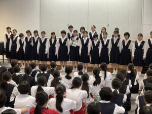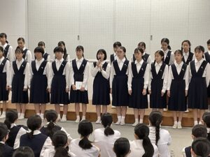 本日、中学の合同朝礼で生徒会役員の交代式が行われました。