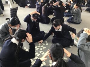 1月23日に百人一首大会がありました。今年は前年度同様に、腕に覚えありのクイーンコース、お楽しみのエンジョイクラスに分かれての実施となりました。クイーンクラス、エンジョイクラスともに白熱した試合となり、自分のお気に入りの札をとれたときには大喜びをする様子も見られました。