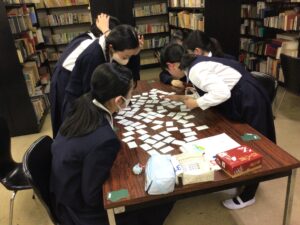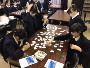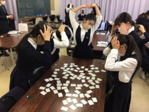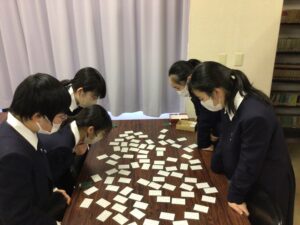 本日、中学1年生が明日に行われる百人一首大会に向けて合同練習をしました。