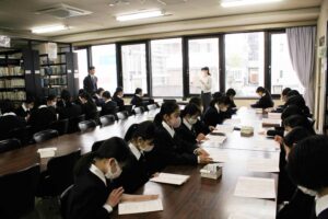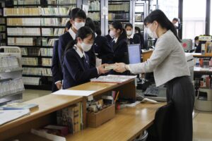 司書の先生から基本的な使い方やおすすめの本を説明していただき、生徒は実際に本を読んだり借りたりしました。早速、本を借りている姿が見られました。中学生活で沢山の本を読んでもらえたらと思います。