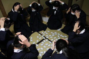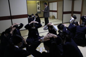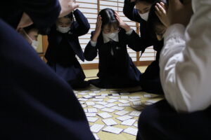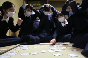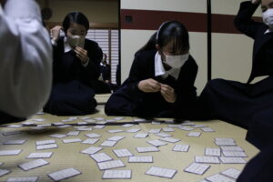 いよいよ百人一首大会を明後日に迎え、礼法室で実戦形式の練習を行いました。各自が短歌を覚える努力を重ねた結果、1月の練習の時よりも多く枚数を取ることが出来たようです。練習も白熱し、1枚1枚取るごとに歓声があがっていました。本番が楽しみです。