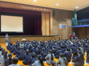 この講話は、日常生活で特に自転車利用時に必要な知識を身につけ、交通ルールを守り、自他の命を大切にする責任ある行動を学ぶことを目的としています。 講話では、交通安全の重要性や自転車利用時の注意点、道路の安全な通行方法について、具体例を交えて分かりやすく説明していただきました。