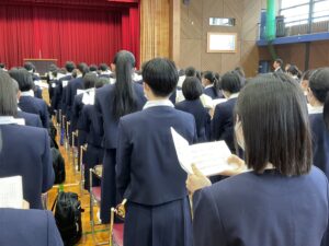 担任の発表や、カトリック学校ならではの、お祈り・聖歌の練習がありました。