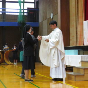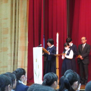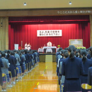カトリックでは、11月を「死者の月」と定め、亡くなった方々のご冥福を祈る月としています。本学院でもその習慣に沿って学院慰霊祭を行い、創立以来、学院の発展に寄与されてきた先人方を偲びます。また、家族や友人で亡くなられた方、各地での災害に見舞われた方々のために祈りを捧げました。