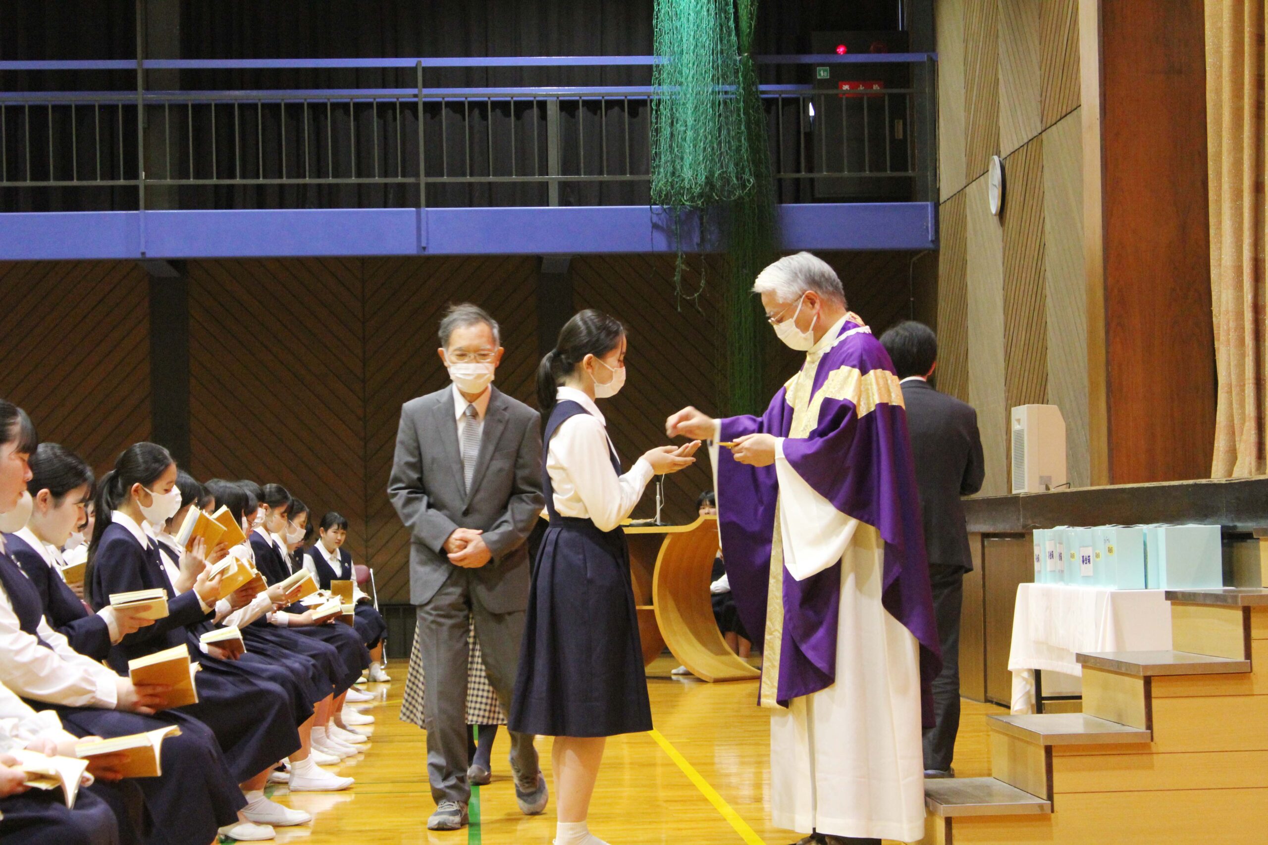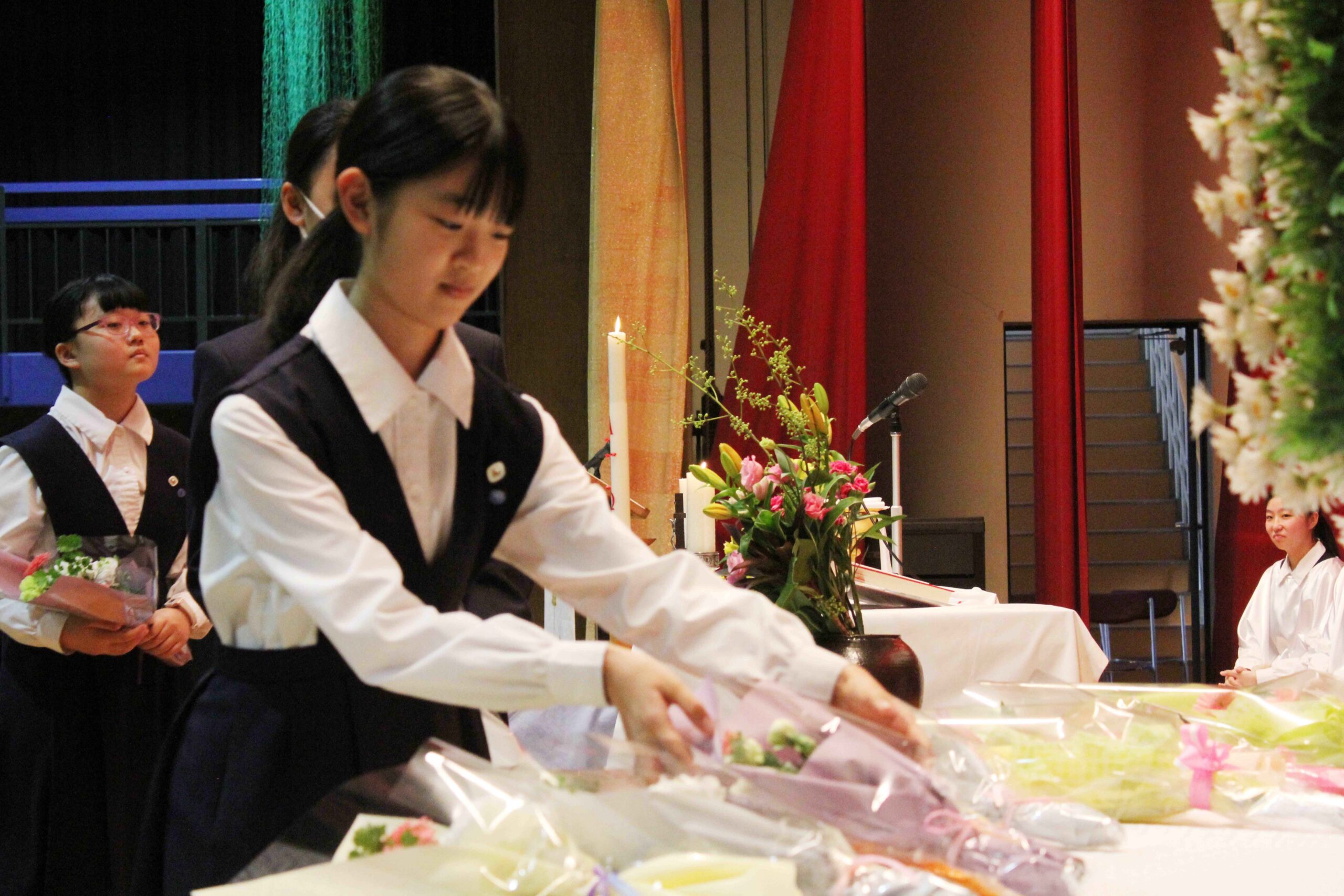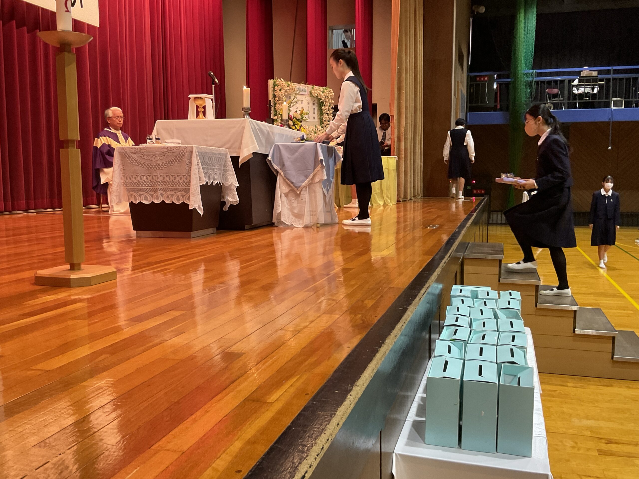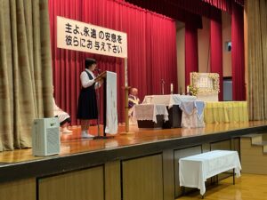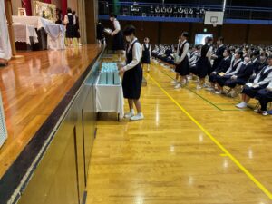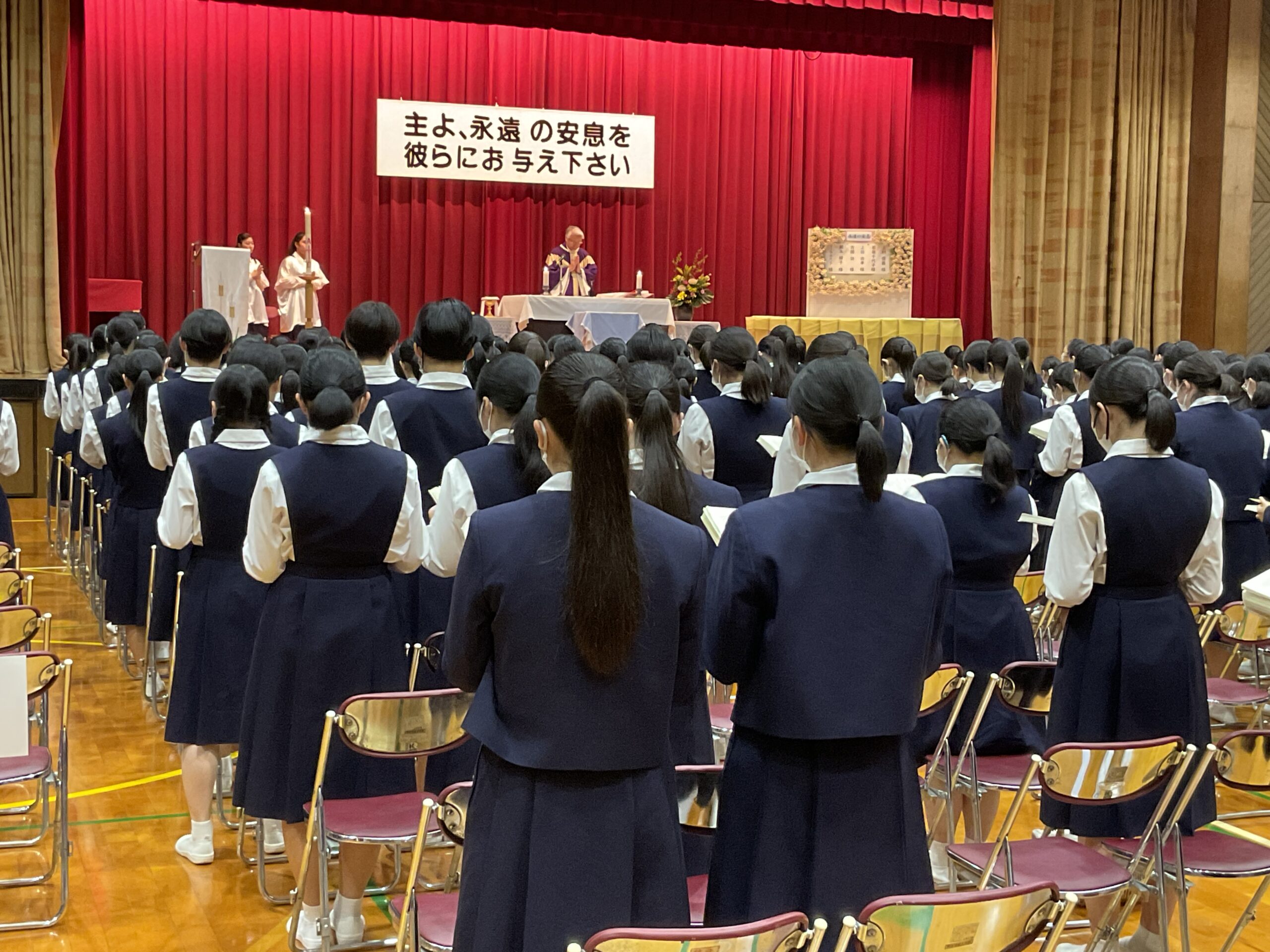 本日、学院慰霊祭を行いました。カトリック教会では11月を死者の月と定め、なくなった方々のご冥福を祈る月としています。本学院でもその習慣に沿って学院慰霊祭を行い、亡くなられた学院関係者や家族、知人、災害に見舞われた方々のために祈りを捧げました。