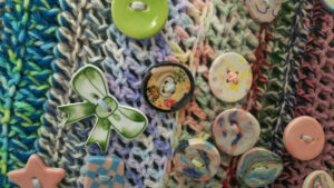 細部は、手編みで作られたボディの上に岩﨑さんが焼いた2000個のボタンが配置され賑やかな感じです。
