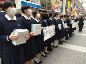 1/27(土)にも街頭募金活動を行いましたが、今回は約100名の生徒が上通・下通・新市街アーケードで募金を呼び掛けました。温かいお言葉も頂きながら、多くの方々が募金してくださったおかげで、この日の総額は539,450円となりました。深く感謝申し上げます。