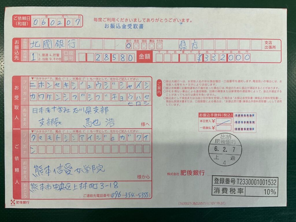 今回集まった募金は1/27(土)の実施分と合わせて、全額の1,040,890円を、2/7(水)に日本赤十字社の「令和6年度能登半島地震災害義援金」に送金しました。