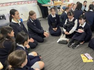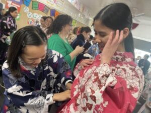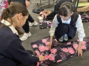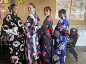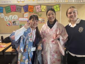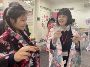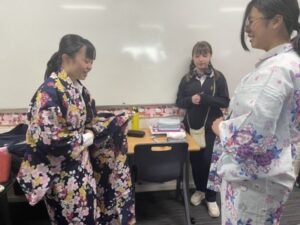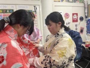 こちらはセントコロンバス生の皆さんが、浴衣の着付け体験をしているところ
