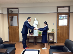熊本西税務副署長の内布様と税務広報広聴官の宮本様が来校され、賞状と記念品を授与していただきました。
