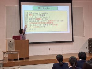 講師に 消費者支援ネットくまもと 佐藤良子様をお招きし、契約や信用情報についてご説明いただき、また定期購入や通信販売のトラブルにどのように対処すればよいのか教えていただきました。