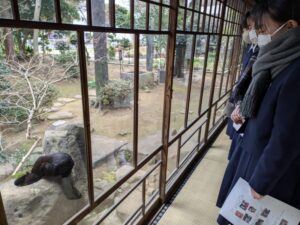 ガイドの方に案内していただき、庭や展示を見物しました。よく遊びに来るという猫たちにも、運よく会うことができました。