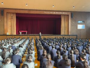 本日、普通コース・総合進学コースの朝礼が行われ、コース主任の木﨑先生よりお話がありました。