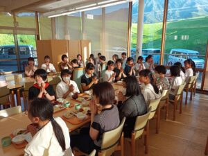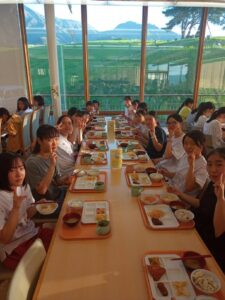 阿蘇外輪山を一望できる食堂で、生徒たちはバイキング形式の食事を楽しみました。暑さに負けないよう食事もしっかり食べて、元気に学習会を楽しんでいるようです。夜の学習時間では積極的に教師に質問するなど、熱心に学習に取り組んでいました。