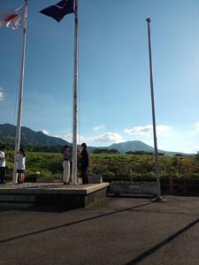 夕べの集いでは、本校生徒が国旗降納を担当しました。
