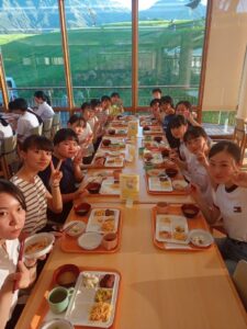 阿蘇外輪山を一望できる食堂で、生徒たちはバイキング形式の食事を楽しみました。暑さに負けないよう食事もしっかり食べて、元気に学習会を楽しんでいるようです。夜の学習時間では積極的に教師に質問するなど、熱心に学習に取り組んでいました。