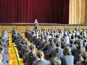 (木﨑先生)先日1年生の修学旅行がありました。随所に信愛生として成長した姿が見られ、大変うれしく思います。2年生はいよいよ受験生です。目標とする進路を様々に掲げていますが、勉強をしなければ実現することはありません。何かを成し遂げる人は、誰に言われずとも、人知れず努力をしているものです。先生に言われてする段階を卒業し、自ら動く皆さんになってほしいと思います。