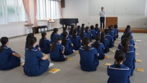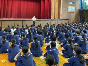 (大倉先生)日本は法治国家であり、私たちがさまざまな法律やルールを守ることで社会は成り立っています。学校にも校則というルールがあり、それを守らない人がいると学校生活のどこかに、必ず綻びが生じてしまいます。ルールを守るという意識を持ち、その輪を情報ビジネス科から学校全体に広げてほしいです。そして、そんなすばらしい情報ビジネス科の伝統を信愛に残せるよう、一人一人が心がけていきましょう。