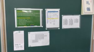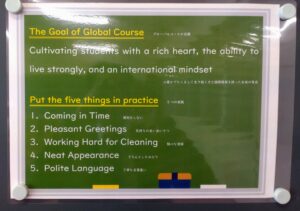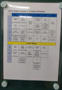 コースの目標や、時間割も英語で作られています。少しずつ、日常的に英語に触れる取り組みです。