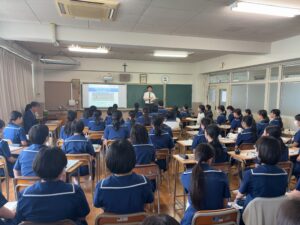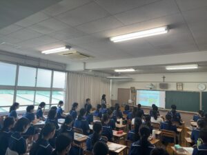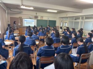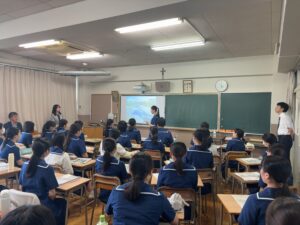 本日は、LHRの時間に熊本大学大学院から皆川朋子教授にお越しいただき、ご自身の研究内容や研究者を志したきっかけなどについて講演していただきました。