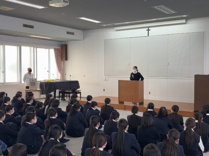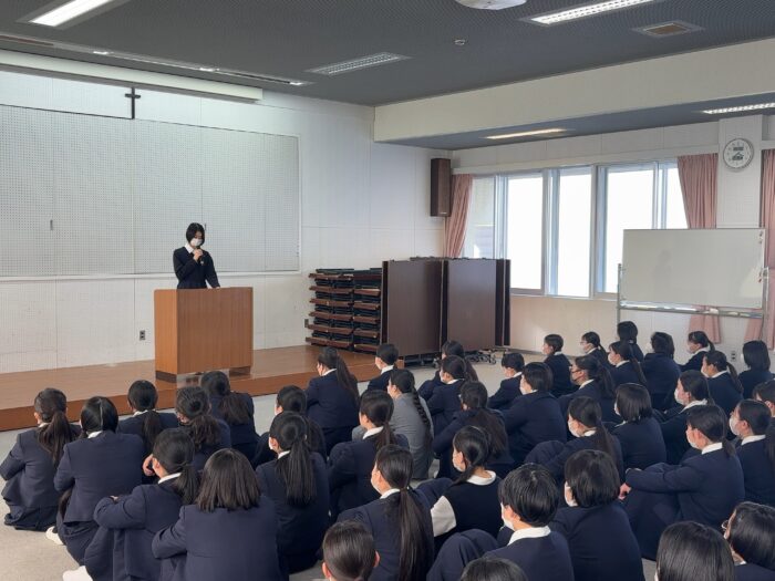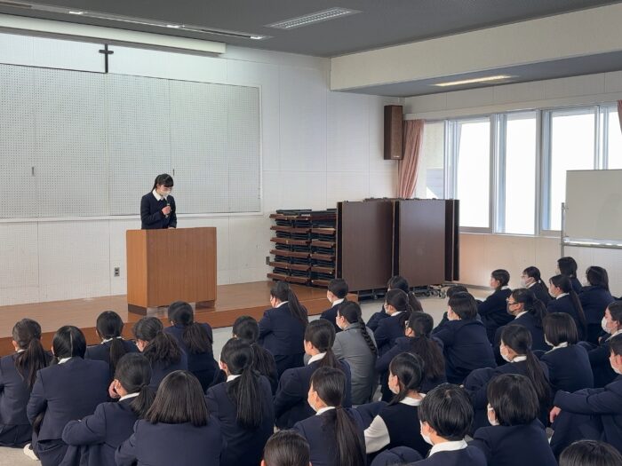 本日のLHRの時間で、普通コース3年生4名の生徒が、総合進学コース2年生へ、進路・受験について体験をもとに話をしてくれました。