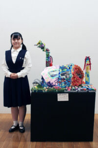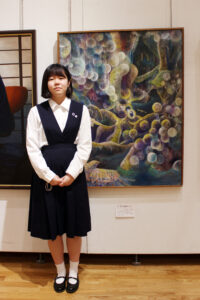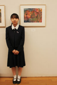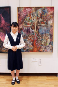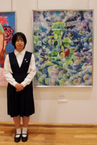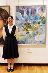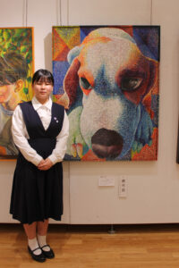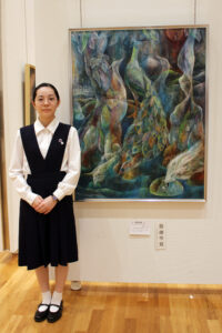 第49回高等学校美術展において、2年の岩﨑文音さんが最優秀賞を受賞し、来年の7月末に香川県でで行われる全国高等学校総合文化祭に出場、また、1年の福島かんなさんが来年の6月に沖縄県で行われる全九州総合文化祭に出場を決めました。2年の陳内悠羽さんが優良賞を受賞しました。日頃の努力の成果が実って素晴らしい結果につながったと思います。今後のさらなる活躍を期待しています。受賞結果は以下の通りになります。また、6月に開催された熊本県高等学校写生大会で特選を受賞した3年の谷本真愛さんの作品も展示されました。