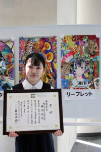5月14日(火)に嘉島町民館において、熊本県高等学校総合文化祭のポスター図案選考において最優秀賞を受賞した3名と標語選考において最優秀賞を受賞した1名の表彰式が行われました。本校からは、ポスター図案選考で最優秀賞を受賞した普通科2年の陳内悠羽さん(宇土鶴城中出身)が表彰されました。陳内さんの作品は、リーフレットとして採用されています。リーフレットは会場で配布されます。