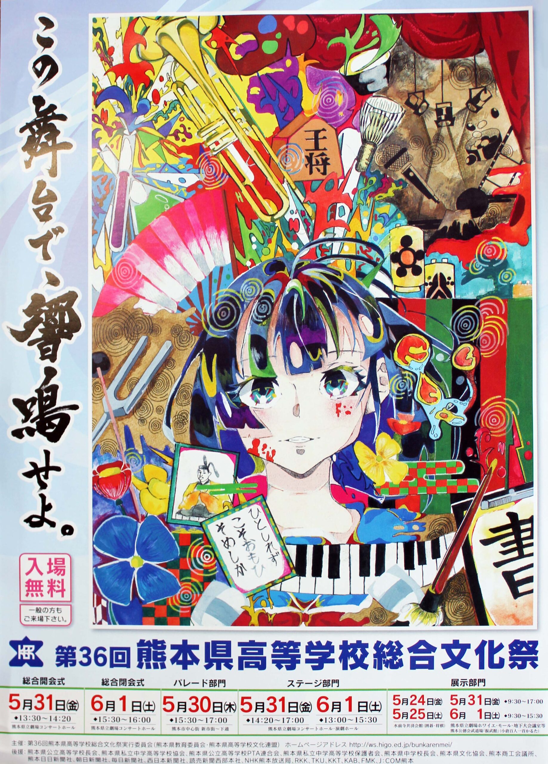 熊本県高等学校総合文化祭は、5月30日(木)から開幕します。5月31日(金)と6月1日(土)には熊本県立劇場で展示部門の展示とステージ部門の発表が行われます。本校からは、美術部、書道部、写真部、演劇部、茶道部が出場予定です。宜しければ、ご観覧ください。
