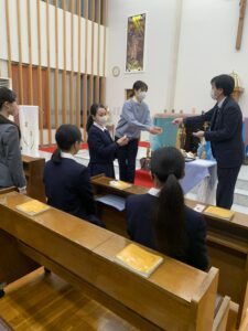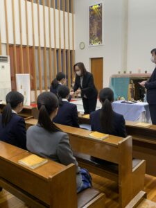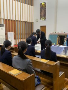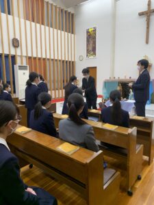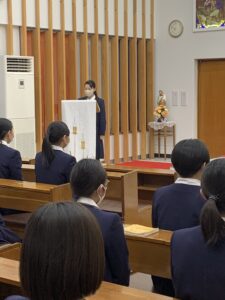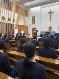 御聖堂は凛とした雰囲気に包まれ、高3生徒は引き締まった表情で教師の講話を耳を傾けていました。