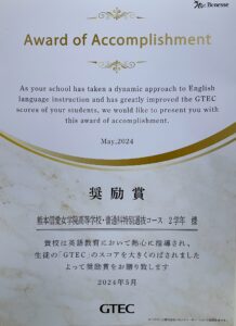 2023年度2~3月にGTECを受検し、過去の受検結果からスコアが一定以上伸びていると認められ、株式会社ベネッセコーポレーションより本校にGTEC学校表彰状を送っていただきました。