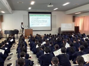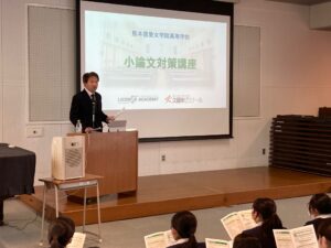 あと2か月で進級です。本格的に進路を考える時期になりました。生徒にとっては今回の講演が、小論文の力を伸ばしていこうと思うきっかけになったことだと思います。何が求められているかをしっかりと理解し、進路実現を目指しましょう。