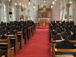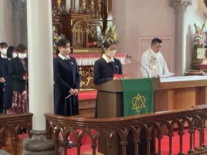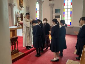 卒業を間近に控えた今、高校生活最後のミサとなります。厳かな雰囲気の中、共同祈願を行い、聖歌を歌いました。神父様からは、お話を頂き、一人一人祝福していただきました。高校で過ごした日々を振り返り、この先どのように生きていくかに思いを馳せる時間となりました。