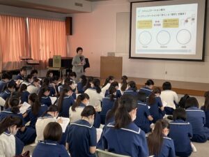 株式会社さんぽうより財津先生を講師としてお招きし、講演をしていただきました。面接におけるコミュニケーション能力や第一印象の重要性についてお話があり、理想的な姿勢・お辞儀の仕方についても実践を交えてご指導くださいました。また、後半では各クラスの代表者6名が模擬面接を行いました。それぞれ緊張しながらも立派に自分の考えを述べることができ、先生からは「全員が自分自身の言葉で思いを表現できていた」とお褒めの言葉を頂きました。