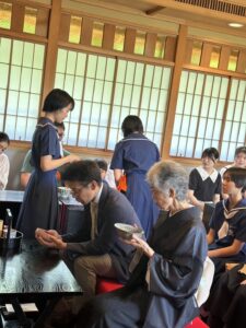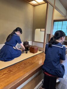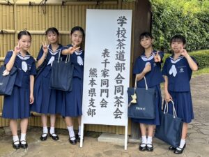 第20回表千家学校茶道部合同茶会が白川公園茶室で行われました。県内の中学、高校、大学が集まり茶会を催します。信愛女学院茶道部は25名中14名が参加し、10席中2席を本校高校生が担当しました。この日のために特訓をしてきた生徒たちは、ギリギリまで確認して、お客様をお迎えしました。猛暑の中たくさんのお客様がお越しになり、生徒たちも暑さに負けずおもてなしをしていました。