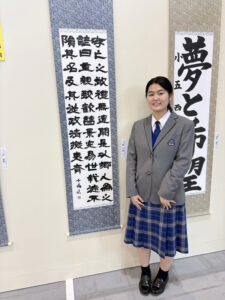 第47回読売学生書展において、普1ー2 森千晶さんが県知事賞を受賞し、福岡で行われた表彰式に出席しました。併せて書道部から4名が特選を受賞しています。 森さんの作品は、半切(縦135cm×横35cm)に後漢時代(185年)に作られた曹全碑を臨書したものです。入学してから隷書を学び続け地道に練習を重ねてきました。その成果が結果として形になり嬉しく思います。今回の喜びを励みに更に頑張って欲しいと思います。