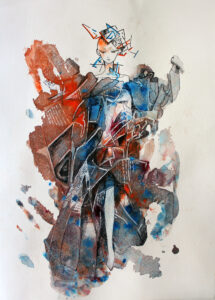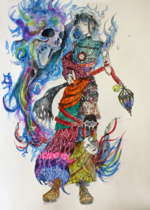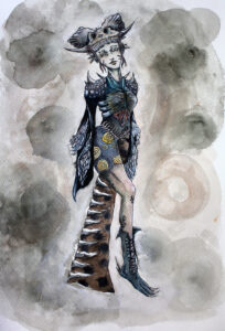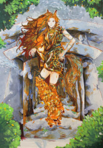 添島さんの作品は、茶やオレンジを基調としたドレスで、田山さんは「背景の鳥居と合わせて、キツネと和をイメージさせる作品で、絵の技術や感性がすばらしい」と仰っていました。