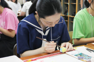講演会と講評会の講師は、「取材の楽しみと日本画制作について」というテーマで、日本画家の中村譲 氏(尾道大学大学日本画コース教授・院展同人)です。自身の制作を通して、取材とスケッチ、日本画におけるアイデアスケッチに当たる小下図の大切さについて、話してくださいました。2日目の生徒交流では、香川の伝統工芸について深く学びを深める場となりました。今回の様々な体験や鑑賞活動などを通して学んだことを今後の創作活動に生かして更なる成長を遂げてくれることと思います。