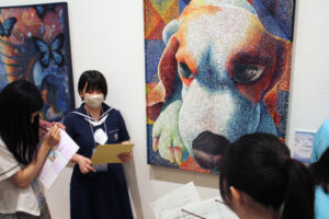1日目は、美術工芸部門の開会式では、沖縄の文化など沖縄の魅力に触れる良い機会となりました。開会式の後の交流会Ⅰでは、沖縄にまつわるクイズなどが行われて大会中に色んなイベントで行動を共にする班員(各県の代表者で構成)との交流を深める場となりました。その後、交流会Ⅱでは、沖縄県立美術館の展示会場で班ごとに各自の制作した作品のプレゼンテーションを行いました。自身の作品を客観的に見る目を養うとともに他者の作品を鑑賞することで表現の幅を広げる良い機会となったと感じます。